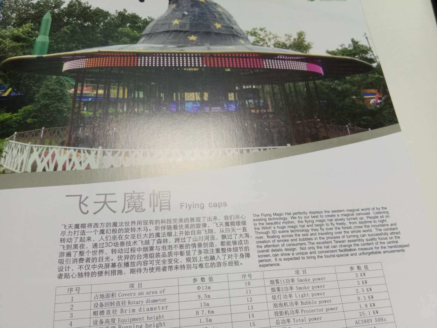 如下圖飛天魔帽也是我們龍之盈游樂設(shè)備有限公司生產(chǎn)出來(lái)的兒童游樂設(shè)備,聽伴隨著優(yōu)美的旋律,飛天魔帽緩緩的轉(zhuǎn)動(dòng)了起來(lái),人們坐在女巫巨大的魔法帽上開始自有的飛翔,從白天一直飛到黑夜,通過3D場(chǎng)景技術(shù)飛越過了森林,跨過了山川河流,飄過了大海游遍了整個(gè)世界,轉(zhuǎn)動(dòng)過程中煙霧與泡泡不斷的情景創(chuàng)造,都能夠成功吸引消費(fèi)者的目光。