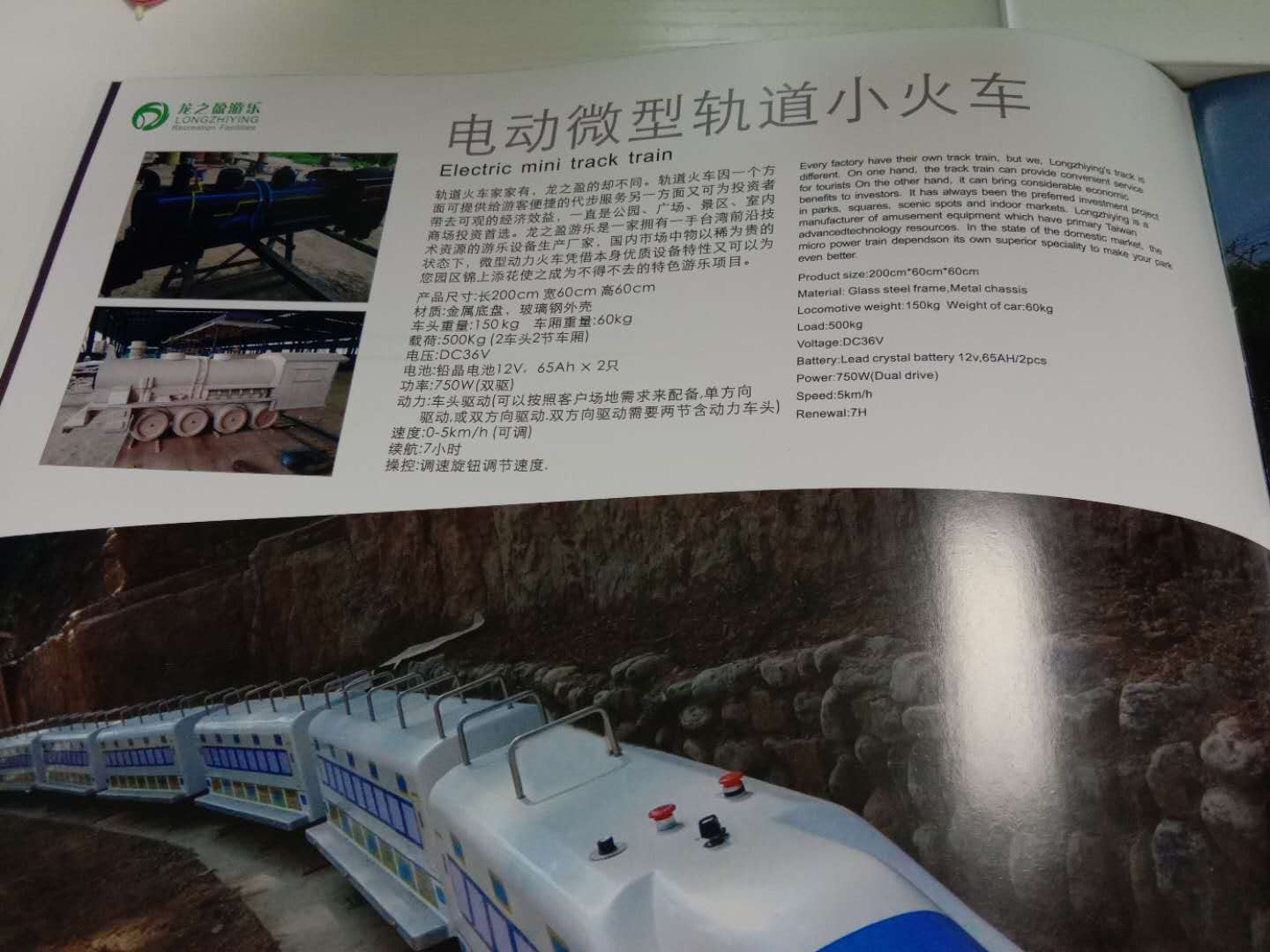下圖是我們龍之盈游樂公司生產(chǎn)的電動(dòng)微型軌道小火車的圖冊(cè)介紹,我拍的不是很清晰,在給你們?cè)敿?xì)的介紹一下吧,軌道火車很多游樂場(chǎng)里面都有,但是龍之盈的卻不同。軌道小火車因一個(gè)方面可提供給游客便捷的代步服務(wù),另一方面又可為投資者帶去可觀的經(jīng)濟(jì)效益,一直是公園、廣場(chǎng)、景區(qū)、室外商場(chǎng)投資的*選。